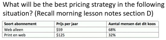 For the two flipped classrooms (GFC and NFC), there were two hours of knowledge application (Figure 5) and two hours of assignment discussion (Figure 6) during the late afternoon of Day-1 and Day-2, respectively. In the knowledge application lessons, the teachers introduced a topic or questions that focused on applying the knowledge learned. For example, as shown in Figure 3, the learners learned different pricing strategies in the morning lessons and then attempted to apply them in real or simulated business scenarios. These lessons were intended to strengthen their ability to apply their knowledge for solving real or simulated business problems, which was knowledge transferability and most relevant to their jobs and employment. Lastly, the assignment discussion lessons on Day-2 allowed the learners to discuss the individual assignment questions and learn with their peers collaboratively. Peer-to-peer interactive and collaborative learning could inspire further thoughts, ideas, and solutions to the business problems listed in the assignment questions. Learners could renew and relearn in the process. Because the learners in the flipped classrooms (GFC and NFC) were aided by the knowledge application and assignment discussion lessons, they subsequently required less time to complete the same assignment writing required for all three experimental groups after the classroom lessons. By contrast, those in GTC had to work on their assignment writing from the beginning and required more time to complete it by themselves after classroom lessons.