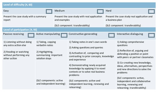 Qualitative data sources included Item 18 of the learner survey, class observation reports, and learner interviews. Class observation was adopted for evaluating learner engagement in in-class activities in accordance with the recommendation of a prior study []. Studies have found learners’ behavioural and cognitive engagement to be reflected in their participation in learning activities [,]. Another study found that the willingness and effort to exceed minimum requirements and adopt more challenging presentation methods indicated a higher learning engagement []. Thus, teaching assistants recorded class observation reports which focused on two aspects of the learners’ engagement: (1) the level of difficulty that they chose for their case study results presentation and (2) their learning participation. Learning participation ranges from passive receiving, active manipulating, and constructive generating to the most engaging interactive dialoguing []. Learner engagement and their participation also reflected the different components of SLE []. Teaching assistants recorded the learners’ participation in in-class activities by checking one box each for the level of difficulty and level of participation, respectively, that most closely matched their observations of classes during the in-class case study lessons (Figure 7).