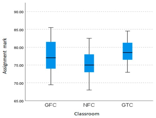 The Kruskal–Wallis test indicated a significant difference between the three classrooms in terms of the assignment marks obtained in the second module (H = 7.550, p = 0.023). Figure 8 shows a boxplot of the results.