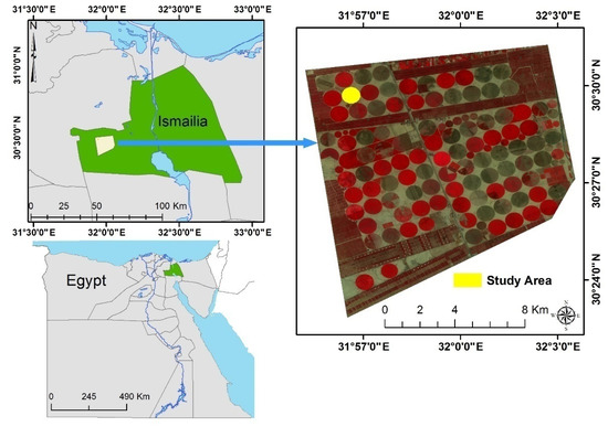 The Salhiya area is located between 30°29′00″ N and 30°30′00″ N latitude, and 31°56′00″ E and 31°57′00″ E longitude and situated at the eastern Nile Delta, Ismailia governorate, Egypt. The study area represented by 1 pivot within area about 67 hectares, as shown in Figure 1.