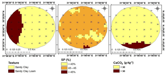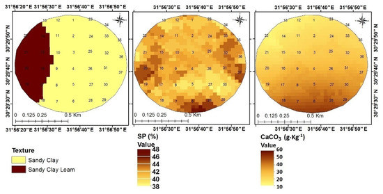 Values of saturation water percentage SP are relatively high and varied from 38% to 48%, which reflects a relatively high clay content and the sandy clay and sandy clay loam texture classes, these results agree with the results who indicated that El-Salhiya area characterized by clay loam, sandy loam, sand, and sandy clay loam texture [56]. Calcium carbonate is present in all of the studied samples with percentages varying from 0.59 to 6.1% and an average value about 2%. Digital maps of soil physical properties were categorized into suitable classes and used to identify soil units [39,40,43]. Soil texture maps were categorized into two classes, Sandy Clay Loam and Sandy Clay, in most of the pivot area. In addition, the results showed that the soil contains a low amount of CaCO3, which was categorized into two classes. i.e., above 3% and less than 3%,and represents most of the pivot area. The Saturation Percentage (SP) values obtained from soil analyses were categorized into three classes, i.e., below 43%, 43–45%, and above 45% as shown in Figure 4.