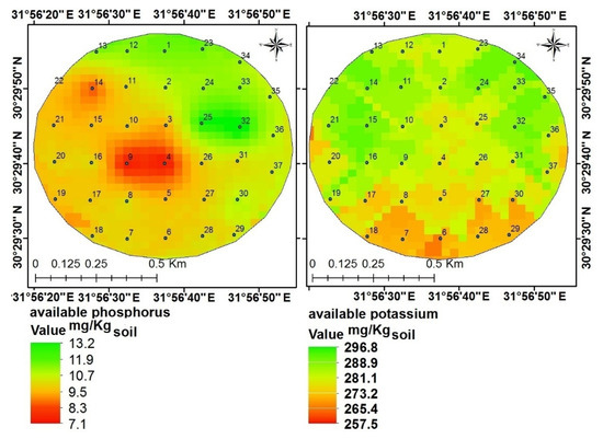The data of the soil characteristics and the available P, K, Fe, Mn, and Zn of soil samples collected from different location of the studied pivot were classified [48]. Available P data were classified in three classes (Figure 9) as high (<12 mg kg−1soil), medium (between 10–12 mg kg−1soil), and low (10 mg kg−1soil) content [43]. However, available P use efficiency may have influenced by many factors related to P fertilizer, the crop grown, and mainly to the soil pH, the content of CaCO3, and clay.