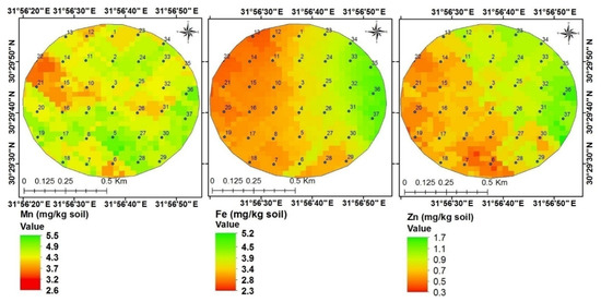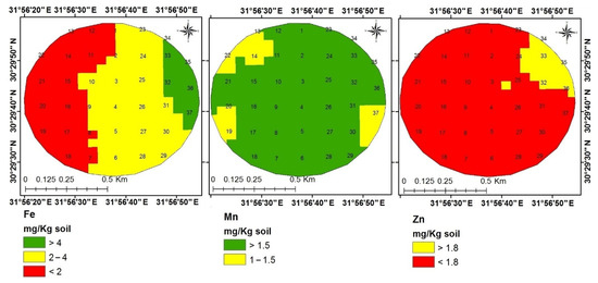 The data of available K were arranged in three classes (Figure 9) as high content (more than 250 mg kg−1soil), medium content (from 200–250 mg kg−1soil), and low content (less than 200 mg kg−1soil) [43]. The available Iron was arranged in three classes (Figure 10), namely, high content (more than 4 mg kg−1soil), medium content (between 2 to 4 mg kg−1soil), and low content (less than 2 mg kg−1soil) [57]. In general, Iron (Fe) and micronutrient use efficiency may have been influenced by some factors such as soil pH and the content of CaCO3, OM, and clay. Available manganese was categorized into two classes as high content, “more than 1.5 mg kg−1soil”, and medium content, “ranged from 1–1.5 mg kg−1soil” [57]. Furthermore, available zinc (Zn) was categorized into two classes (Figure 10), medium and low; the medium class contains available zinc (Zn) more than 1.8 mg kg−1soil,and the low class contains available zinc less than 1.8 mg kg−1soil.