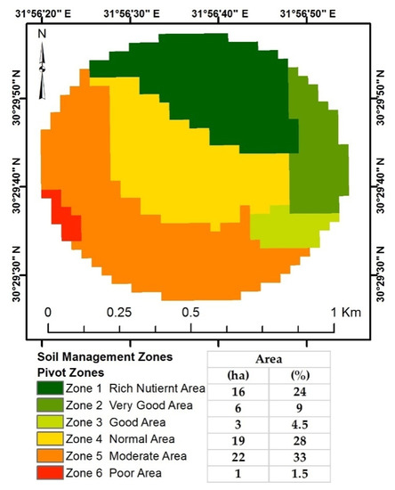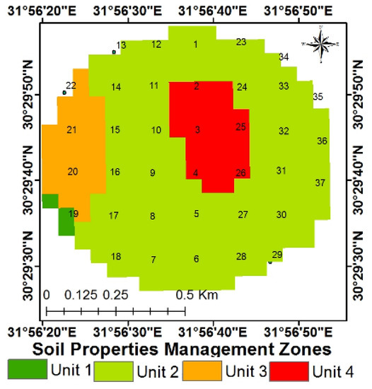 In many cases, grid sampling at the force required to effectively describe variability in soil and crop parameters demonstrated cost restrictions [17], while other authors concluded that site-specific agriculture is a management philosophy, including the utilization of advances in data technology in farming [39]. In last decade, site-specific crop management (SSCM) has been used for enhancing soil productivity, decreasing environmental impact, and risk minimization [39]. The aim of this research is to present the results of using GPS and soil samples for delineating management zones within an irrigated peanut pivot situated at the eastern Nile Delta, Ismailia governorate, Egypt.
