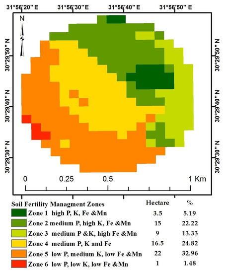 In the meantime, the overlay technique was used to combine the soil classified maps of available P, K, Fe, and Mn. The output of overlay layers contained six soil fertility management zones, differing from each other with the area of different soil management zones. The results of Figure 12 also show soil units based on fertility level in the following descending order: