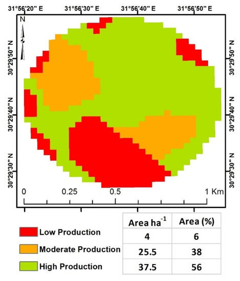 Table 15 show the result of potassium application using VRT and according to the current fertilizer price; in traditional agriculture, the fertilizer application of 42 (K) kg ha−1 equal to 130 kg potassium sulphate costs EGP 1400 Egyptian pound per hectare and around EGP 94,500.0 for the total pivot area, while total potassium fertilizer costs with site-specific applications were EGP 80,168.0.