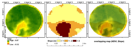 Data of the soil such as soil texture, soil type, elevation of the landscape, and slope allow for sampling the study area into similar classes and in smaller units along the crop productivity map. The explanation of Nitrogen heterogeneity within the pivot appeared after overlapping the topography map with the NDVI map, where, in the high slope areas, a Nitrogen deficiency exists (Figure 16).