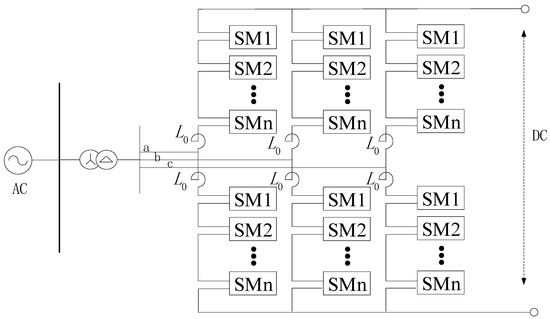 The most important feature of the modular multilevel converter is that it has many series sub-modules, which are arranged in groups called bridge arms [38]. Figure 1 shows the topological structure of the three-phase modular multilevel converter. The upper and lower bridge arms together are called one phase, so there are six bridge arms in three phases. The upper and lower ends of one phase are connected to the DC system, and the three-phase AC system is connected to the midpoint of each phase (A, B, and C) respectively. In general, the bridge connected to the positive pole of the power supply is called the “upper arm”, and vice versa, the bridge arm connected to the negative pole of the power supply is called the “lower arm”. Each bridge arm consists of N sub-modules (SM) and the bridge arm impedance series [39]. The bridge arm acts as a filter inductor, it produces equal and opposite harmonic voltage, limiting current caused by transient voltage difference sub-modules, weakening the higher harmonics in the bridge arm current, short-circuit fault current in DC lift restrictions is at a very low level, with AC harmonic voltage offset bridge arm, and steady DC voltage.