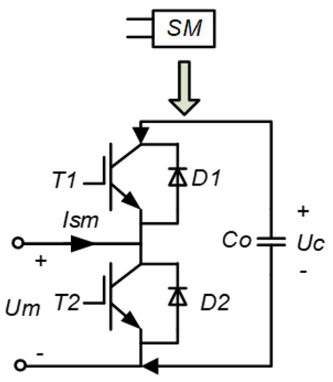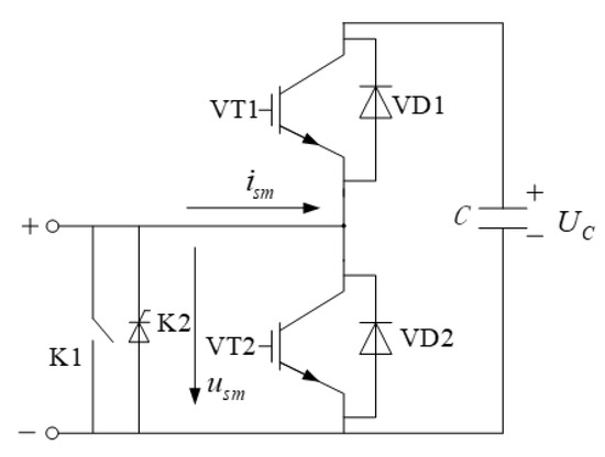 Several topological structures of sub-modules have been mentioned in previous studies, among which the most common are full-bridge and half-bridge. The half-bridge sub-module can only generate zero voltage and positive voltage, so the DC voltage component is inevitable in the bridge arm, the half-bridge sub-module is selected only when the MMC is connected to the DC system. The full-bridge sub-module can generate both zero voltage and positive voltage as well as a negative voltage. Therefore, this sub-module can be connected to both AC and DC systems. Because there are only two switches in the half-bridge sub-module, the number of components is less and the work efficiency is higher, while the full-bridge sub-module needs to use more components.