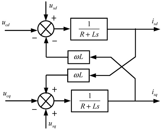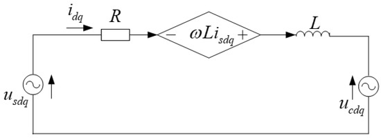 First of all, the current and voltage output values are input to the master controller, and the reference value of the control quantity is input to the master controller. The master controller performs a d-q decoupling transformation to generate the required modulation wave and transmits it to the modulation part. Secondly, the modulation part receives the modulation wave signal sent by the main controller and adopts the modulation strategy of nearest level approximation to calculate the number of sub-modules that need to be turned on for each bridge arm. Then, according to the number and voltage of the conduction, the sub-module capacitor voltage balances control, usually by using the sequencing method at the same time the modulation part needs to suppress the circulation. Finally, the modulating part transmits the modulating signal to the sub-module to generate the corresponding trigger pulse and control the IGBT on or off. The equivalent circuit of the system in the synchronous rotation coordinate system can be obtained, as shown in Figure 3, as the equivalent circuit of the system in the d-q synchronous rotation coordinate system.