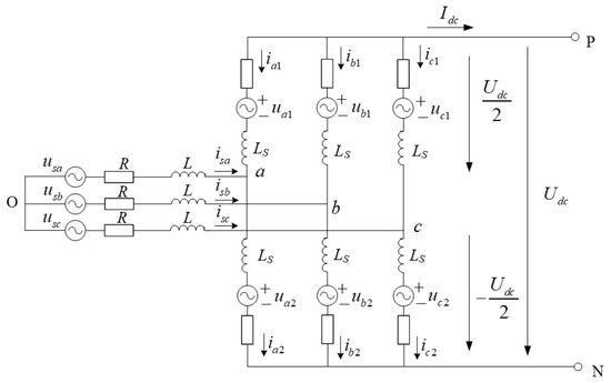 In this paper, the mathematical model is analyzed from the point of view of the rectifier side of the system. The circuit structure diagram of the rectifier side of the MMC is shown in Figure 1.