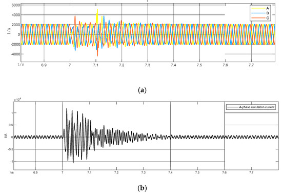 Using the MMC-HVDC system model established above, the bridge arm reactor failure is simulated and verified. The inductance value changes due to the failure of the simulated reactor. When the bridge arm reactor is set to fail for 1 s, the inductance value of the bridge arm decreases from 70 mH to 60 mH in phase A, the simulation results are shown in Figure 8.