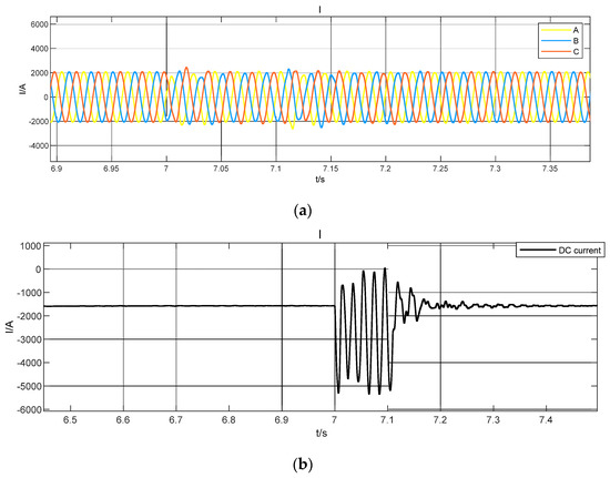 System simulation results when the reactor fails. (a) Three-phase AC current; (b) DC current.