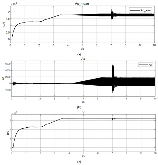 The waveform of each variable of the bridge arm on phase A of the converter station is shown in Figure 10. It can be seen that when the sub-module fails at 7 s, the input of the hot standby redundant sub-module does not affect the original normal operation of the system, because the hot standby sub-module only changes from the excused working state to the put into a working state. Therefore, the input of the bypass faulty module and the hot standby sub-module has no impact on the system operation. In 7.5 s, the sub-module fails, due to the hot standby module being fully committed, the quantity is not enough, so the cold standby module needs to be input. However, cold standby sub-modules of investment have a certain influence on the system, hence, cold standby sub-modules SM33 needs a capacitor charging process to enter a state of normal operation. The charging process is shown in Figure 10a. In the process of input, DC voltage and current oscillate, while three-phase AC voltage and current increase and oscillate. After complete input, the system slowly enters a stable working state. Therefore, the sub-module redundancy protection strategy proposed in this paper can be applied to the case of failure of a few quantum modules, with a short recovery time and a small impact on the system.