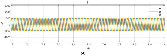 As can be seen from Figure 7, Figure 7a three-phase AC simulates the three-phase voltage on the AC side, and the fault occurs in 7.1 s. The current at the time of single-phase fault is corresponding to three-phase AC. Due to the failure of a sub-module of phase A and insufficient voltage of the bridge arm, the three-phase circuit is asymmetric, the three-phase AC of the system oscillates seriously, waveform distortion occurs, and a large amount of circulation occurs. Therefore, even if a sub-module fails, it will still have a great impact on the system in the absence of protection policies. We should adopt an appropriate redundancy protection control strategy, in the case of sub-module failure, cut off, and put in a new sub-module to replace the faulty sub-module so that the converter station can maintain a normal steady operation.