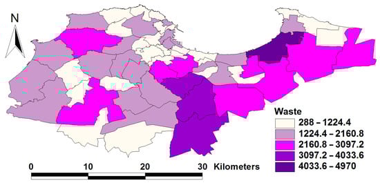 Spatial distribution of the production of waste across the study area. The distribution is based on creating five equal intervals based on the amount of waste generated in each unit (in metric tons).