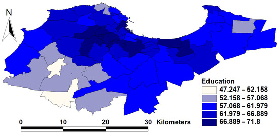 Spatial distribution of the aggregated index across the study area. The distribution is based on creating five equal intervals for aggregated index, built using the four principal components explaining over 90% of the total variation (in terms of the extraction sums of squared loadings—Table 3) weighted by the percentage of variation explained (Table 3).