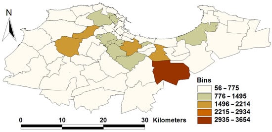 According to the 2008 RGPH, the population of Algiers is about 2,987,160 inhabitants. In 2021, the population was estimated at 3.4 million inhabitants [29]. The population density amounts to ~4450 inhabitants/km2. The wilaya of Algiers is made up of thirteen daïras (administrative districts), each comprising several “communes” (municipalities), for a total of fifty-seven communes.