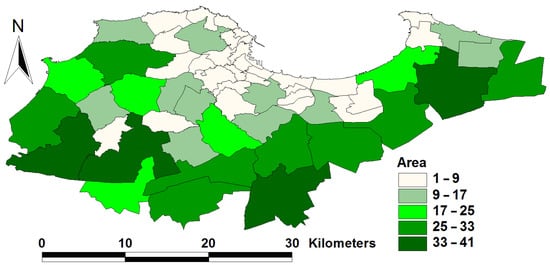 Spatial distribution of the total commune area across the study area. The distribution is based on creating five equal intervals for the total area of communes, in km2.