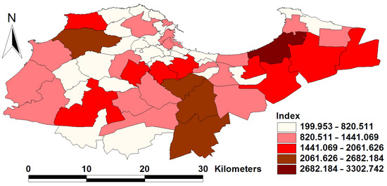 The results presented in Table 3 indicate that the first four components, accounting altogether for over 90% of the total variation (in terms of the extraction sums of squared loadings), and identified in Table 4 with the amount of waste, share of people with at least a college degree, number of garbage bins, and area of the commune, can be used to analyze the territorial differences across the study area. This was achieved by mapping the spatial distribution of each variable (see Figure 3, Figure 4, Figure 5 and Figure 6) and building an aggregated index weighting each variable based on the percentage of total variance explained (column “Extraction Sums of Squared Loadings” in Table 3) and mapping its spatial distribution (see Figure 7).
