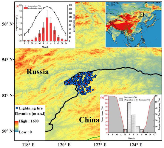 The location of lightning strikes (blue dots) in the study region (the primeval forest region of the northern Daxing’an Mountains, Inner Mongolia, China; (120–122° E and 52–54° N) from 1999 to 2019. The black box in the upper-right inset image represents the boundary of the study region on the map. The red triangles are the location of the weather stations in the study area. The upper-left inset plot (a) shows the monthly average temperature and precipitation in the study area. The lower-right inset plot (b) shows the monthly average snow cover and fire frequency.