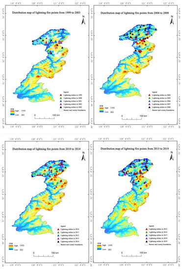 The 245 lightning fires that occurred in the study region between 1999 and 2019 were mainly concentrated from 121°00′11″–121°10′48″ east longitude and 52°39′00″–52°45′49″ north latitude (Figure 2). The frequency of lightning fires was directly related to altitude. However, there was no lightning fire in the study area in 2009. As shown in Figure 2, all lightning fires occurred in the elevation range of 303–1445 m above sea level and were irregularly distributed. Lightning fires were mainly concentrated in areas with elevations of 600–700 m above sea level; 79 fires or 32% of all fires occurred within this elevation range. A previous study has shown that the active area of lightning strikes is affected by the local sources of humidity and the topography [37]. Du et al. reported that lightning fires occur in the elevation range of 200–1300 m above sea level, with fires being particularly concentrated in areas in the elevation range of 300–800 m, which is consistent with our results [38]. The main reasons for the easy occurrence of lightning fires in the middle-altitude area are the high temperature, the easy evaporation of precipitation, and the low water content of combustibles. In contrast, fewer lightning fires were observed at altitudes above 800 m due to lower temperatures, weaker precipitation evaporation, and higher water content of combustibles. In addition, the spatial discontinuity of combustibles in high-altitude areas has a strong inhibitory effect on the occurrence of lightning fires [36]. All together, there is a certain correlation between the occurrence of lightning fires and the altitude. Lightning fires mainly occur in the middle-altitude areas in the primeval forest region of the northern Daxing’an Mountains, Inner Mongolia.