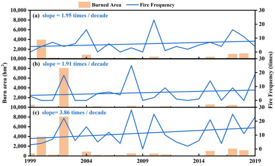 As shown in Figure 3, the frequency of lightning fires in the study region from 1999 to 2019 was different in the early season (May to June), late season (July to September), and the entire fire season (May to September). The lightning fire frequency showed an overall upward trend over time, with increase rates of 1.95, 1.91, and 3.86 times/decade. It has been found that with the global warming in recent years, extreme weather such as high temperatures and drought in the Daxing’anling Mountains have increased significantly, which makes the summer forest lightning fires in this area increase year by year. Simultaneously, the main tree species in this study area are coniferous forests, which have high lipid levels and are flammable. The combustibles of coniferous species and coniferous forests are more susceptible to lightning fire than other types of combustibles [38,39]. Coniferous forests are mostly located at high latitudes in cold temperate zones, where the frequency of cloud-to-ground lightning is higher than in low-latitude regions, which is also an important reason for the increase in the frequency of lightning fires [40]. However, in this study, the frequency of lightning fires did not show a significant increasing trend (p > 0.05). At the same time, there is no obvious change in the area of lightning fires over the past 20 years (p > 0.05). This result may be attributed to fire suppression efforts and greatly increased investment in fire prevention in China. Therefore, strengthening the monitoring and early warning of key periods and key areas of lightning fires can effectively avoid the occurrence of major and extra-large forest fires.