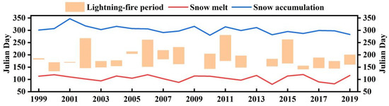 As shown in Figure 4, the Julian dates of summer lightning fires during 1999–2019 were concentrated in 120~280 d. Through the Julian date analysis, the summer lightning fires in this area mainly occurred in late June. With the change in climate, the fire danger period of summer lightning fires was prolonged later. Lightning fires occurred frequently from 152 d to 213 d (around 1 June to 31 July), with a total of 170 fires, accounting for 78% in the past 20 years. However, we found that snow accumulation and snow melt had no significant effect on the lightning-fire period (p > 0.05). At the same time, the high incidence of lightning fires is from June to July each year. By strengthening the aviation patrol during the high-incidence period of lightning fires and carrying out forward garrison, the frequency and the area of lightning fires can be effectively reduced.