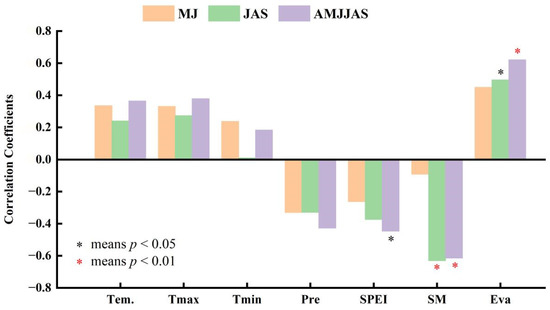 Correlation coefficients between meteorological factors and lightning fire frequency in May to June, July to September, and May to September. The black and red asterisks represent significant levels of over 95% and 99%, respectively. The seven meteorological elements from left to right are: average temperature, maximum temperature, minimum temperature, precipitation, drought index, soil moisture, and transpiration rate.