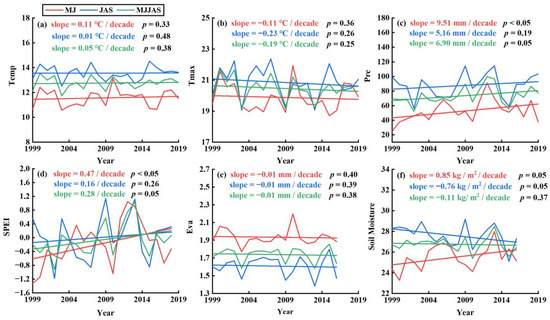 Trends in the meteorological indices in the study region from 1999 to 2019. (a) the average temperature (Temp), (b) maximum temperature (Tmax), (c) precipitation (Pre), (d) drought index (SPEI), (e) evapotranspiration (Eva), (f) soil moisture (SM).