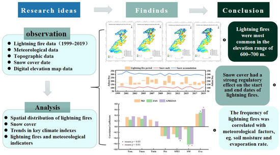 We found that lightning fires occurred most frequently at an altitude of 600–700 m in the primeval forest region of the northern Daxing’an Mountains. Snow cover had a strong regulatory effect on the start and end dates of lightning fires, and snow cover monitoring should be strengthened in high-risk lightning fires areas. The frequency of lightning fires was positively correlated with average temperature, maximum temperature, and surface evaporation and negatively correlated with surface soil moisture (0–10 cm) and precipitation (Figure 7). Acquiring more accurate advance and real-time meteorological monitor data in the future will be useful in the spatially assessment of fire risk, in identifying areas at greatest risk, and in designing long-term lightning fires management strategies.