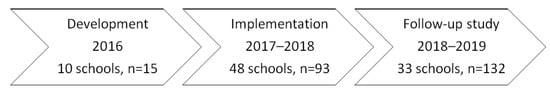 In 2016, 10 comprehensive schools began to participate in a 4-year pilot period. The pilot schools’ participation was based on their own motivation and the agreement of the principal. The entire development and implementation process was based on co-creation, with the schools giving important input for changes and eliciting new social practices [38], which are considered a preliminary condition for a change in general school culture. In 2021, the program has scaled up and 148 schools have joined the network out of the 512 comprehensive schools in Estonia.
