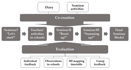 Our task to design teacher training seminars involves multifaceted action research and ensuring that the new practices work in real-world school settings [43]. Based on theoretical frameworks, a general model of teacher training seminars and materials was planned and developed.