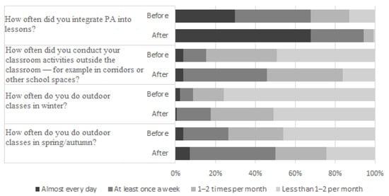 The proportion of teachers who reported using MI almost every day after the AL seminars was 68% compared to 30% before the AL seminars. In addition, the proportion of teachers who reported conducting their lessons at least once a week outside the classroom increased almost four times (42% after the AL seminars vs. 11% before the AL seminars). Similarly, teachers reported the use of outdoor teaching practices at least once a week more often after the AL seminars (for both the spring and winter periods). Results indicated that the daily use of MI, teaching outside the classroom, and outdoor learning were generally not common practices before the AL seminars.
