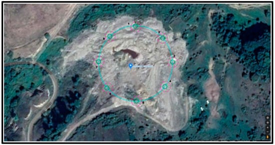 The two analyzed metallurgical waste samples were taken from the Păgida slag dump, Alba County, Romania. For a better representation and variability, the two samples consist of a mixture of 128 subsamples of metallurgical wastes (sample 1 is composed of 64 subsamples, sample 2 is composed of 64 subsamples), taken from eight sampling points representing the north, north-east, east, south-east, south, south-west, west and north-west directions. A metallurgical waste sample is composed of 64 subsamples. The first sample consists of a mixture of metallurgical solid wastes, taken from a circle with a radius of 5 m around each of the eight sampling points. The second sample consists of a mixture of metallurgical solid wastes, taken from a circle with a radius of 15 m around each of the eight sampling points. The sampling points were recorded using GPS (Table 1). In order to evaluate the homogeneity of the metallurgical wastes from the slag dump, eight sampling points were established (Figure 2), which correspond to the center of the concentric circles (the circles represented in black have a radius of 5 m and the circles represented in pink have a radius of 15 m). Eight subsamples were taken from each sampling point. The 64 subsampling points, corresponding to a sample, are shown in green.
