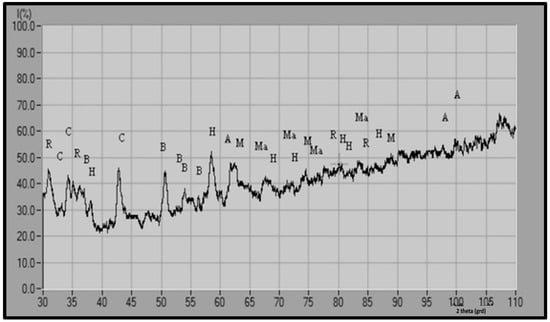 The diffractogram of metallurgical waste sample 1. Legend: R—(Fe–Ringwoodite (Fe2(SiO4))); C—(Calcium iron oxide (CaFe3O5)); B—(Brownmillerite FeAlO3(CaO)2); H—(Hedenbergite CaFe(Si2O6)); A—(Andradite (calcium iron silicate) (Ca3Fe2 + 3(SiO4)3)); M—(Magnesioferrite (MgFe2O4)); Ma—(Magnetite (Mg.04Fe2.96O4)).