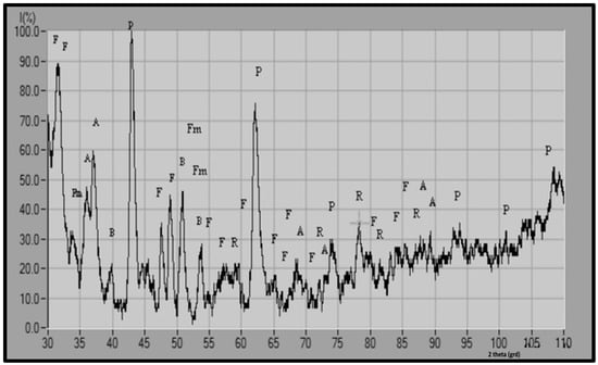 The diffractogram of metallurgical waste sample 2. Legend: F—(Fayalite magnesian manganoan (Mg.145Fe1.742Mn.113SiO4; Mg.347Fe1.548Mn.105SiO4)); Fm—(Fayalite manganoan ((Fe,Mn)2SiO4)); A—(Andradite (calcium iron silicate) (Ca3Fe2 + 3(SiO4)3)); B—(Brownmillerite (Ca4Al2Fe2 + 3O10)); P—(Periclase (MgO)); R—(Fe–Ringwoodite (Fe2(SiO4))).