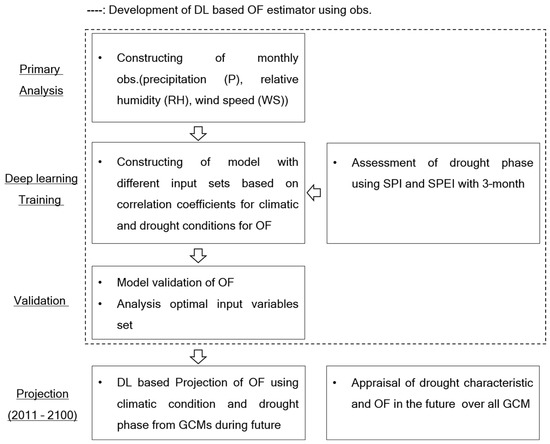 This study projected the future OF using CMIP6 global climate models (GCMs) that were statistically downscaled to the locations of observation stations. Downscaled GCM data, monthly precipitation, relative humidity (RH), and wind speed (WS) series of the historical period were validated using the observation data. A deep learning model was developed to simulate OF with hydro-meteorological variables (RH, WS, and SPI3) as input data, considering the quantified relationship between OF and hydro-meteorological variables. Subsequently, the future OF was projected using the developed deep-learning model. Moreover, this study explored the relationship between future OF and drought characteristics to determine the drought characteristics’ influences on OF. The overall procedure of this study is illustrated in Figure 1.