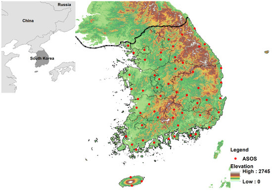 South Korea is geographically located at mid-latitudes and has complex climatic regimes with distinct seasonal changes. The East Asian monsoon brings warm and moist air masses over South Korea, which causes heavy rainfall during the summer season [28]. Meanwhile, South Korea is exposed to cold air masses from Siberia, which creates a considerably cold and dry climate during the winter season. Approximately two-thirds of South Korea is a mountainous region that is located in the north south direction along the eastern part of South Korea (Figure 2).