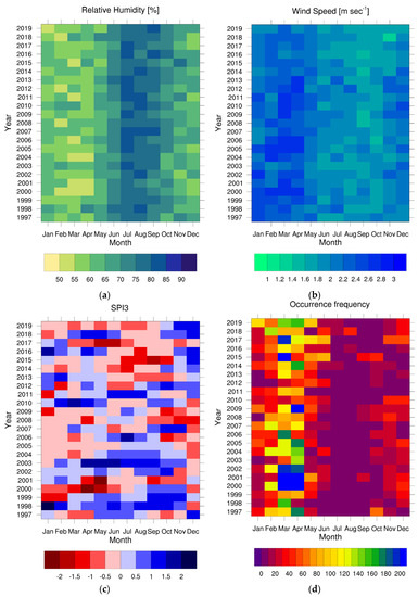 Monthly series of the observed climate variables and SPI3 (presented by color gradation): (a) relative humidity, (b) wind speed, (c) SPI3, and (d) OF for South Korea.