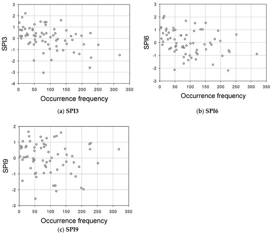 The SPI is generally created for different accumulation periods of one to 36 months. In the case of one- or three-month periods, short-term droughts were caused by a lack of precipitation during a short period of time. On the other hand, in the case of 12-month periods (SPI12), long-term drought caused by a persistent shortage of precipitation was evaluated. Many studies have assessed the relationship between forest fires and drought; for example, Sung et al. [7] indicated the role of the drought index in improving the performance of forest fire prediction using deep learning techniques. Thus, this study utilized a deep-learning-based model to estimate the OF with a drought index based on an analysis of the correlation between OF and SPI (Figure 5).