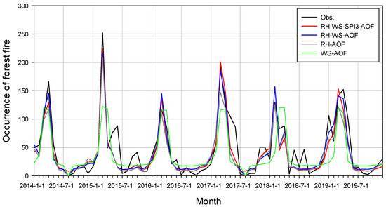 The evaluation of the DBN model based on four different combinations of input data sets (RH-WS-SPI3-AOF, RH-WS-AOF, RH-AOF, WS-AOF) was conducted using three preference indices (root mean square error, RMSE; Nash–Sutcliff efficiency, NSE; and determination coefficient, R2) in Table 2. The acronyms in front of the AOF are independent variables, whereas AOF is the dependent variable of the DBN model. The RH-WS-SPI3-AOF and RH-WS-AOF matched the observations well; however, WS-AOF did not. The NSE and R2 values of RH-WS-SPI3-AOF were 0.837, and 0.855, which were superior to those of RH-WS-AOF, RH-AOF, and WS-AOF. The DBN model improved when the drought index was included. It was similarly explained in previous studies that RH and WS, including drought, caused OF.