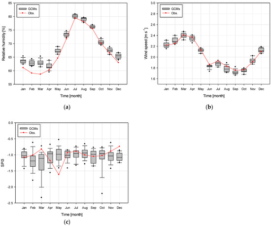 This study compared the simulated RH, WS, and SPI3 series with observations from 1997 to 2019. Overall, the RH values driven by the GCMs were overestimated; however, the monthly variability was well matched with the observations (as shown in Figure 7a). The inter-model variability (range of the box plots) was larger when RH was relatively low. The simulated monthly variabilities of WS were also well matched to the observations (as depicted in Figure 7b). In the case of SPI3, the value was examined only when it was less than or equal to −0.5. Although SPI3 was well matched with the observations, SPI3 (≤−0.5) in Figure 7c could not output close values to the observations in a few months, such as March and May. This finding indicates that the GCM-based SPI3, where it was less than or equal to −0.5, was weakly evaluated in the past climate.