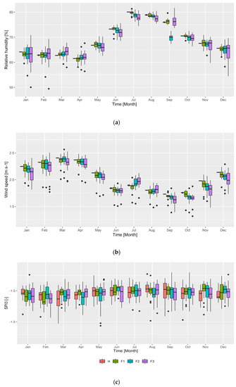 Monthly variability between GCMs of (a) relative humidity, (b) wind speed, and (c) SPI3 (≤−0.5) data in all periods (H, F1, F2, F3).