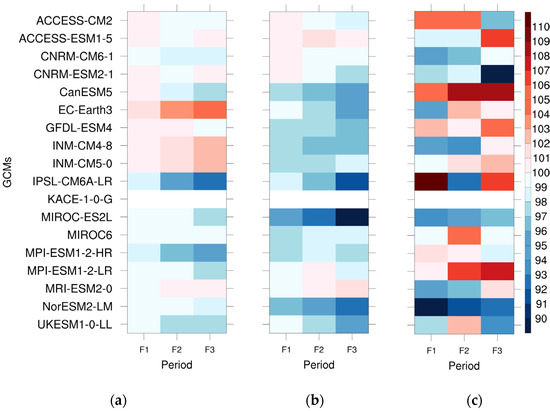 In this study, 18 GCMs (Table 1) were spatially downscaled and systematic bias was corrected using the quantile mapping (QM) method with the observation data. QM corrects the systematic error of raw GCM data to fit the target cumulative distribution function (CDF) assuming that the statistical distribution of the target data is stationary. Observational data from 39 years (1972–2010) were used to develop the target CDF. For future projections, three future periods were analyzed under climate change scenarios: (i) early (F1: 2011–2040), (ii) mid-century (F2: 2041–2070), and (iii) late 21st century (F3: 2071–2100).