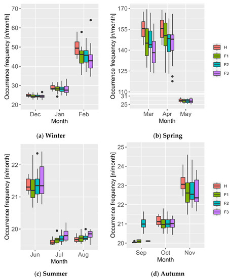 Wildfires in Korea occurred more frequently in spring (March to May) than in other seasons, and the same tendency was projected in the future. The OF in the spring season was projected to decrease in the future by 11%, 8%, and 2% in the F1, F2, and F3 periods, respectively, according to the increase in RH compared to the current period. However, it was projected that the future OF in the summer season (June to August) would increase by 15% compared to the current value. On the other hand, the OF in the autumn and winter seasons was projected to decrease compared to the current period.