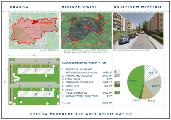 Table 2 summarises the area of the surfaces that receives precipitation in the Bohaterów Września housing estate in Krakow and in the reference complex (the Bio-Morpheme). These values were used as data for rainwater harvesting volume in further sections.