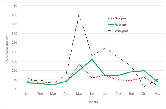 The proper assessment of rainwater volume is very difficult and carries the risk of inaccuracies due to the significant uneven rainfall incidence over time. This is clearly a key issue in the dimensioning of RWH devices. Common practice is that the initial design is based upon long-term average rainwater precipitation; however, tests and observations performed by the authors in the city of Krakow (Poland) have shown that this problem should not be underestimated. Data collected by the authors shows that the maximum observed monthly precipitation was as high as 403.1 mm (2010), while the lowest was observed in November 2010 (0.6 mm) [34]. During relatively low precipitation periods, only household wastewater may be the source of ‘non-tap water’ (water which is not sourced from the municipal waterworks). By contrast, during periods of heavy rainfall, the inflow of this water is much higher than the actual demand. The monthly precipitation value tended to vary between years, and years with precipitation significantly lower than average are usually named ‘dry years’, while years when precipitation is higher than average are called ‘wet years’, The impact of the characteristics of the year on the real unevenness of precipitation is shown in Figure 3. Rainfall volume data were obtained by the Cracow University of Technology (CUT) directly from the Institute of Meteorology and Water Management—National Research Institute. Data concerning rainfall intensity were measured by the CUT meteorological station, located in Cracow (Kraków) 24 Warszawska St., as monthly values in millimeters.