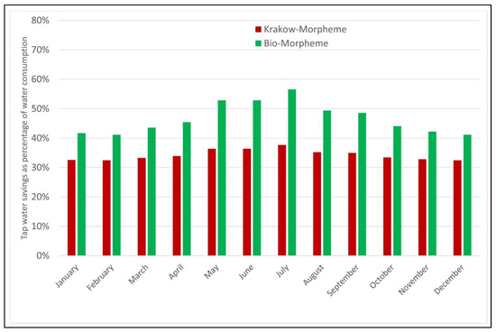 Formulae for RWH volume calculations used surface areas, as presented in Figure 1 (above), and a specific run-off coefficient for impermeable roads, paths and pavements (0.95 was applied, based on own measurements on tarmac in the yard at Cracow University of Technology). This coefficient is generally similar to values from literature [37,38,39] and was confirmed by real tests. Intensive water usage is visibly higher in the summer, due to the climate.
