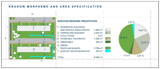 - Access roads, pavements and bicycle paths would be drained with the use of a stormwater drainage system compliant with the DWA-M 153 standard. This would ensure that pre-treatment conditions would be in accordance with the Regulation of the Minister of Maritime Affairs and Inland Navigation of 12 July 2019. Water collected from this part of the area would be directed to the ornamental/recreational element in the form of a pond for the Bio-Morpheme or a watercourse, a reservoir with an elongated shape adapted to the development layout of the Krakow-Morpheme. The reservoirs would have an average depth of 0.70 m. This depth was chosen for safety reasons, as a deeper pond requires protection barriers which could significantly degrade the landscaping of the entirety of the Bio-Morpheme. An analysis of the area size of this element is presented later in the paper.